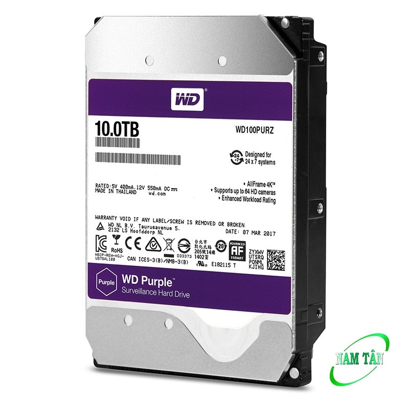 Western Digital Purple 10TB dùng cho đầu ghi camera giám sát tại nhà và doanh nghiệp vừa và nhỏ lên đến 32 camera hoạt động cùng lúc.